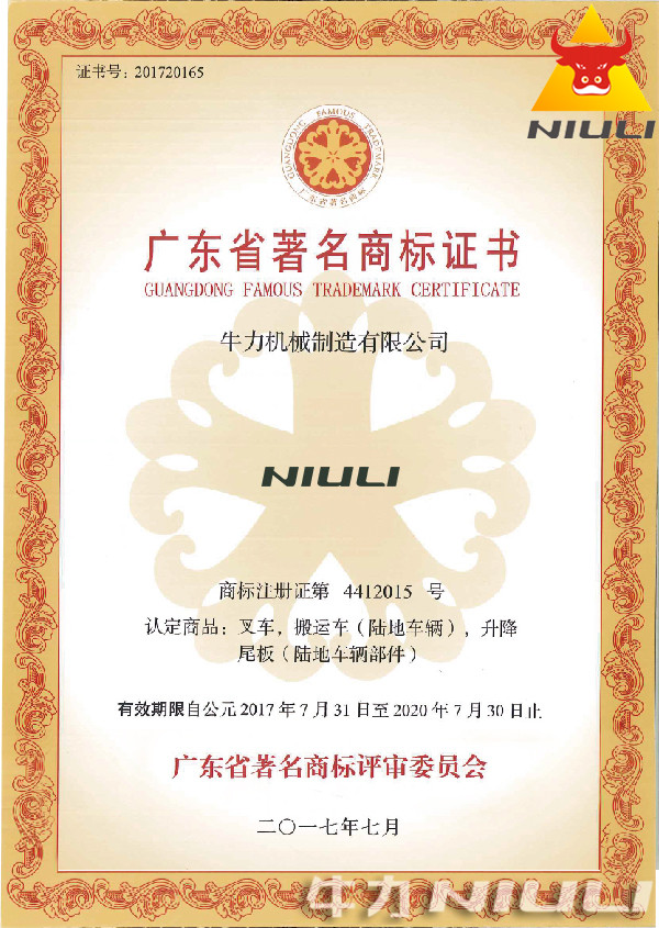2017年7月,牛力榮獲廣東省著名商標(biāo),廣東省著名商標(biāo)是指在廣東省內(nèi)具有較高市場(chǎng)信譽(yù)、為相關(guān)公眾所熟知的注冊(cè)商標(biāo)。這次獲頒 廣東省著名商標(biāo)證書(shū),標(biāo)志著牛力的品牌知名度已經(jīng)達(dá)到相當(dāng)?shù)母叨群退疁?zhǔn),叉車(chē)、搬運(yùn)車(chē)、升降尾板已經(jīng)擁有物流設(shè)備制造業(yè)的著名品牌口碑。