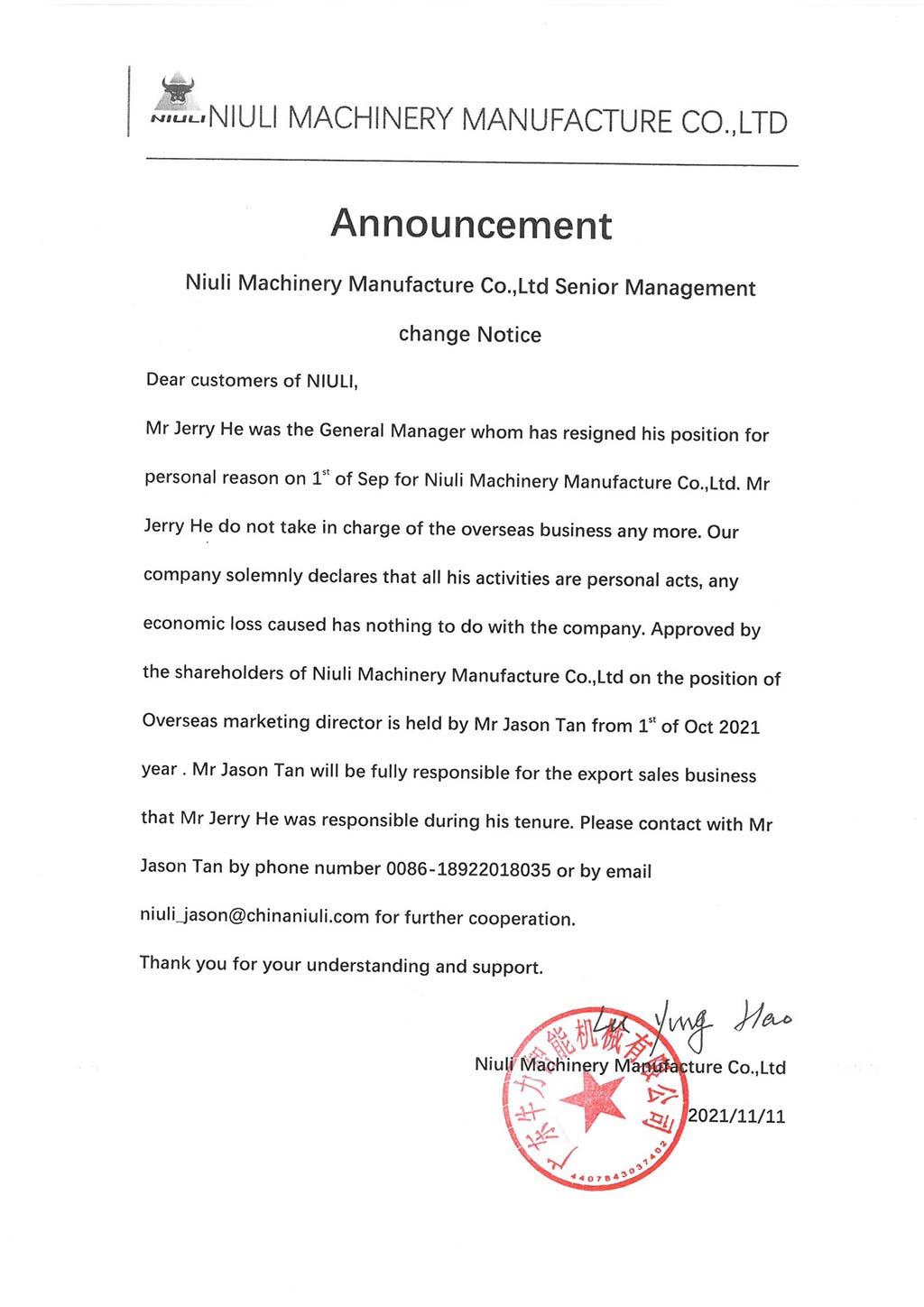 牛力機械制造有限公司高管變動公告
