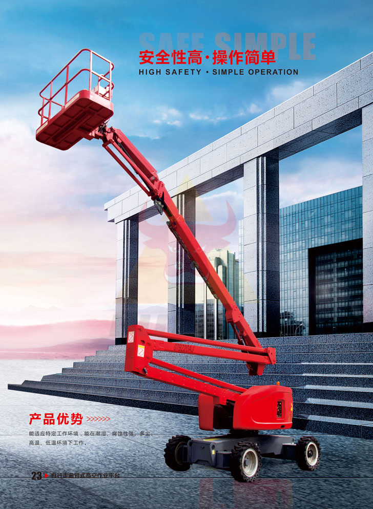 曲臂式高空作業(yè)平臺具有伸縮臂,能懸伸作業(yè),跨越一定的障礙或在一處升降可進行多點作業(yè);升降平臺移動性好,轉移場地方便;外觀美觀,適于室內(nèi)外作業(yè)和存放。